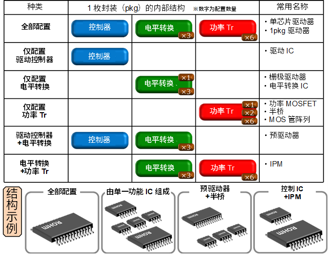 内置两种功能模块的IC需要与具备另一种功能的IC组合使用。驱动控制器+电平转换的IC优点是可以改变与功率晶体管的组合,减少布线数量,但无法减少与功率晶体管相连部分的电子元器件数量。而电平转换+功率晶体管的IC则保留了全功能集成IC的易用性,又支持与驱动控制器的组合变更。但是设计灵活性存在一定限制,例如无法调整功率晶体管的开关速度等(※部分产品内置特殊电路,可以调整或选择开关速度)。