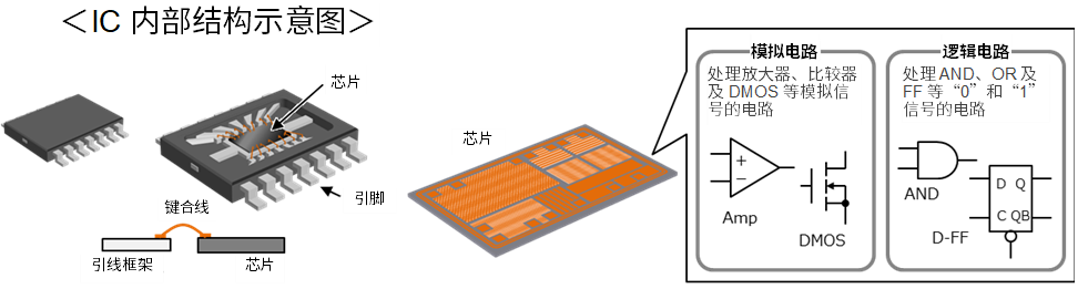 IC通常采用的内部结构如下图所示。内部的芯片通过引线(引脚)和键合线进行连接。芯片上集成有称为“模拟电路”和“逻辑电路”的电路,其中模拟电路负责与IC外部的信号交互、电源的产生和时钟信号的产生等,而逻辑电路则负责处理电机驱动信号的产生等。