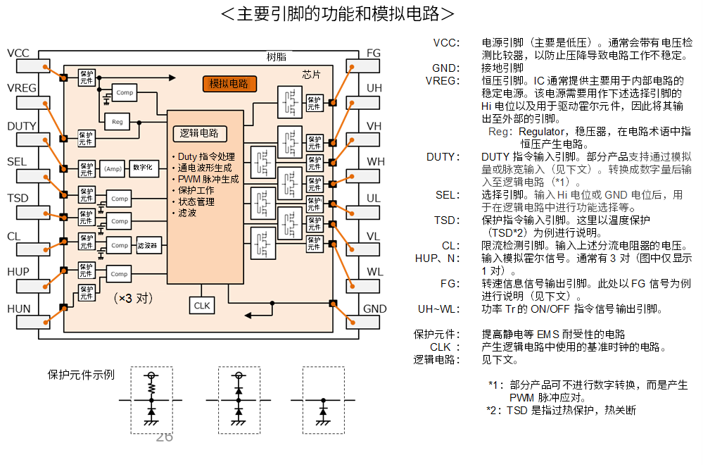 以下为电机控制器(控制IC)的引脚和电路示例。该示例中使用的是具有霍尔信号输入规格的控制IC。