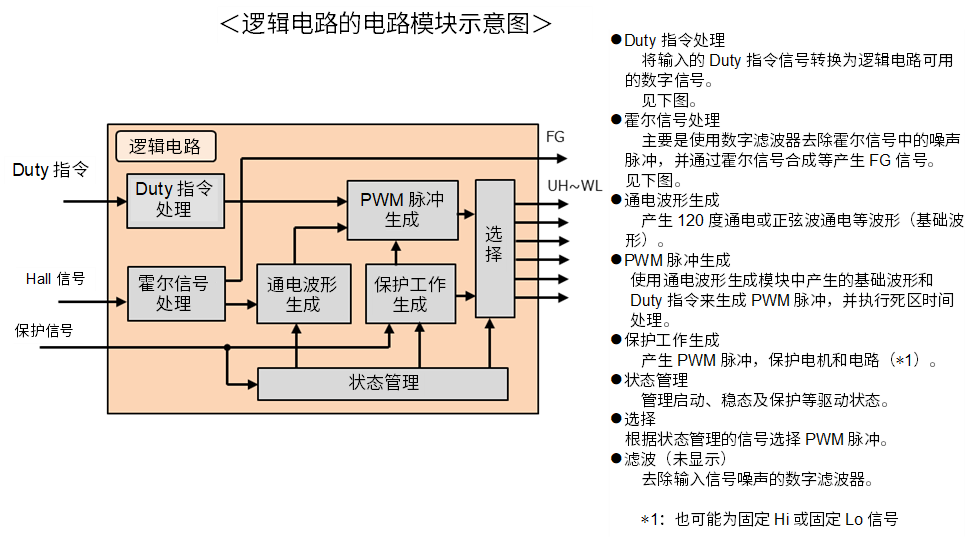 接下来介绍逻辑电路。逻辑电路是根据转子位置信号和Duty指令产生PWM脉冲或FG信号的电路。