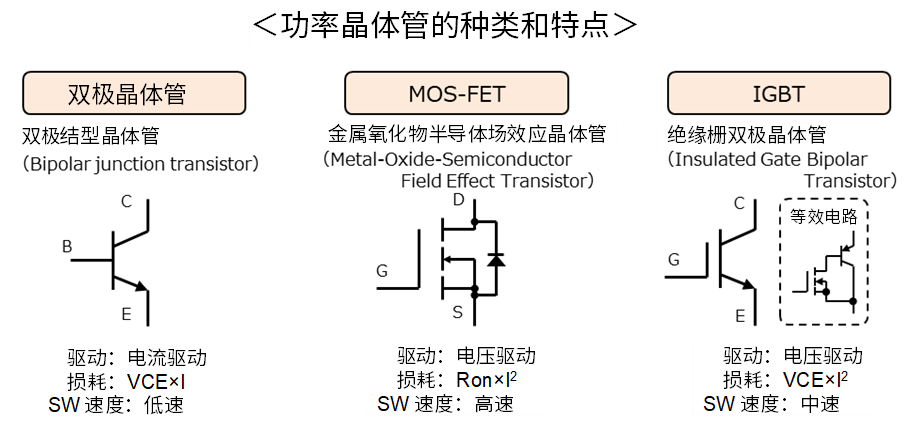 本节首先对构成功率晶体管模块的晶体管——双极晶体管、MOSFET和IGBT的特点进行比较,然后再介绍MOSFET的开/关工作。