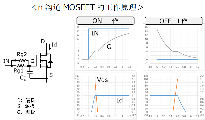 MOSFET会根据施加在栅极上的电压改变状态(见下图)。当栅极电压相对于源极电位上升到阈值以上时,流入绕组的电流将逐渐经由MOSFET后流出。待原本流过绕组的所有电流全部流过该MOSFET后,D—S间的电压下降,晶体管导通。关断过程则相反。