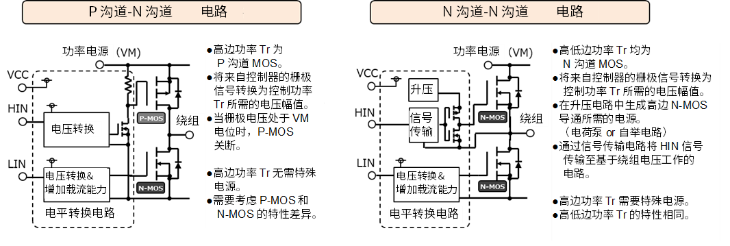虽然有两种结构,但由于低边功率晶体管均为N沟道,因此低边部分的电平转换电路的功能是相同的。该电路将来自控制器的信号转换为能够使功率晶体管完全导通/关断的电压幅值的信号,同时具备电流供应能力。