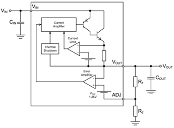 示例中使用的线性稳压器ICBA1117属于可变输出型LDO。可变输出型通过使用外置电阻分压器,可设置任意输出电压值(通常设置范围为从内部基准电压源到IC规定的最大输出电压)。另外,除可变输出型外,还有固定输出型产品。这种是在IC内部内置了分压电阻的产品,可设置5V和3.3V等常见的标准电压,通常仅需外接输入输出电容器即可工作。可根据使用需求,灵活选用可变输出型与固定输出型产品。