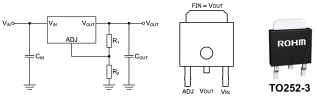 BA1117的封装形式为TO252-3。这是具有可提高散热性能的FIN(也称为“TAB”)的表面贴装型封装,是1A输出级中的典型封装形式。下面是各引脚的功能说明: