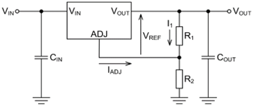 \(V_{\text{out}} = V_{\text{REF}} \times \left(1 + \displaystyle \frac{R_2}{R_1}\right) + I_{\text{ADJ}} \times R_2 \, \text{[V]}\)