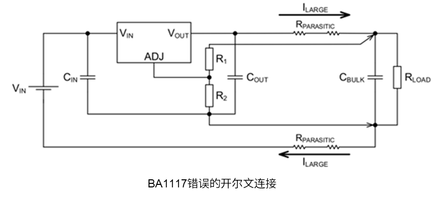 需要注意的是,多数线性稳压器IC均设有接地引脚(浮动工作的BA1117没有接地引脚),由于ADJ引脚与接地之间有基准电压,因此需采用开尔文连接法将电阻分压器上端靠近负载端配置。但要注意,由于BA1117在ADJ引脚与输出\(V_{OUT}\)引脚之间有基准电压,所以其连接方式应与常规接法相反。下图为BA1117错误的开尔文连接方式。此时的输出电压可用后续的公式表示。与上一节给出的输出电压设置用的公式相比,错误的连接方式会导致\(V_{REF}\)项中额外叠加由输出大电流\(I_{LARGE}\)与\(V_{OUT}\)引脚至负载端之间的走线电阻\(R_{PARASTIC}\)引发的电压降。也就是说,负载电流(\(I_{LARGE}\))会导致负载调整性能恶化,这意味着无法获得开尔文连接的效果。