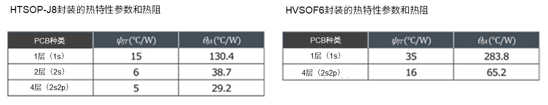 下表所示的热特性参数\(Ψ_{JT}\)及热阻\(θ_{JA}\)的实测值示例