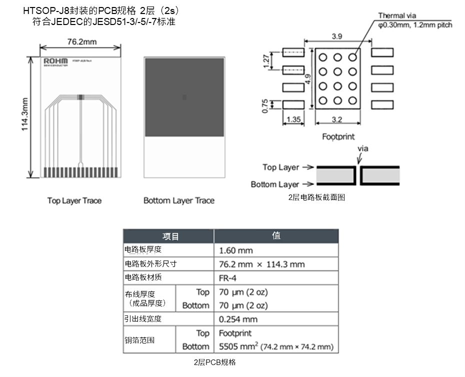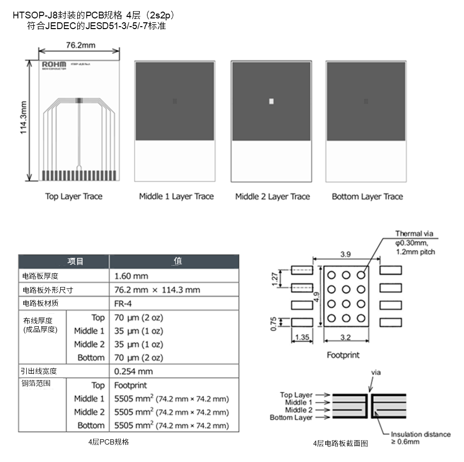 此外,测量所用PCB的规格如下。全部适用于HTSOP-J8封装,依次为1层(1s)电路板(符合JESD51-3/-7标准)、2层(2s)电路板(符合JESD51-3/-5/-7标准)、4层(2s2p)电路板(符合JESD51-3/-5/-7标准)。