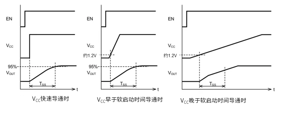 最后右图为EN达到高电平的时间长于软启动时间时的启动特性。从EN电压超过阈值的时刻软启动电路开始工作,输出电压按照设定的软启动时间上升。