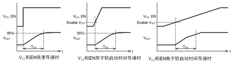 无论哪种情况,软启动都是从EN电压超过阈值的时刻开始,基本不受EN电压达到高电平的时间点影响。当EN电压快速变化时,可以认为EN电压上升到超过阈值直至达到高电平的时间非常短。