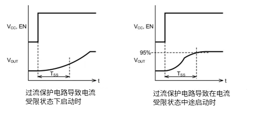 当输出电容器的容量增大时,启动时的充电电流也会增加。虽然这会根据输出电压和过流保护电路的限制值而变化,但当输出电容容量在数μF到数百μF的前半段范围内时,即使充电电流发生变化,软启动时间也会保持恒定进行启动。当输出电容容量达到数百μF前半段以上时,由于充电电流增大会导致过流保护电路工作,此时充电电流会受到过流保护电路的限制。因此,如下面的左图所示,启动时间会超过软启动时间而变长。在此条件下,随着输出电容容量的增加,启动时间也会变长。
