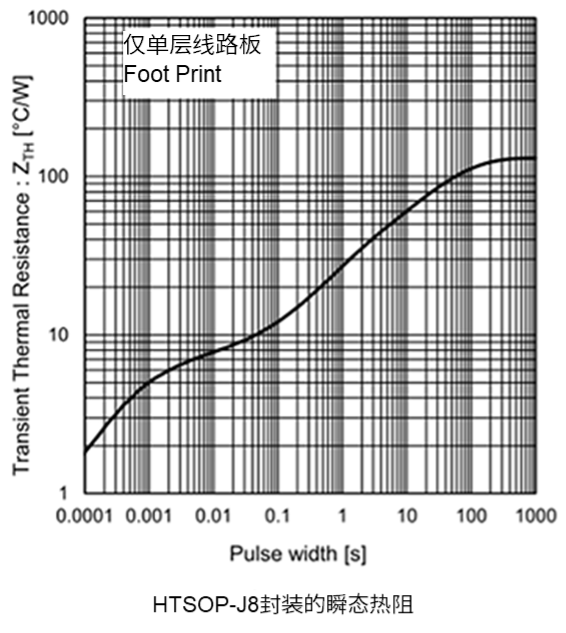 在HTSOP-J8封装中,假设\(T_A\)=60°C的环境下,2A的浪涌电流持续流过1ms,从下述曲线图可知,1ms的瞬态热阻为5℃/W。