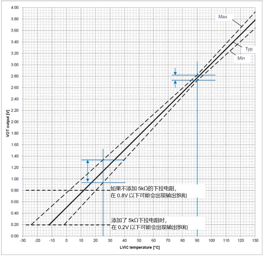 VOT输出电压会随LVIC的温度呈线性变化,因此很容易将电压值转换为温度并进行校正。下图为VOT输出电压变化与LVIC温度变化之间的关系图。蓝线表示规定条件下的温度误差范围。有关下拉电阻的注意事项后续再进行介绍。