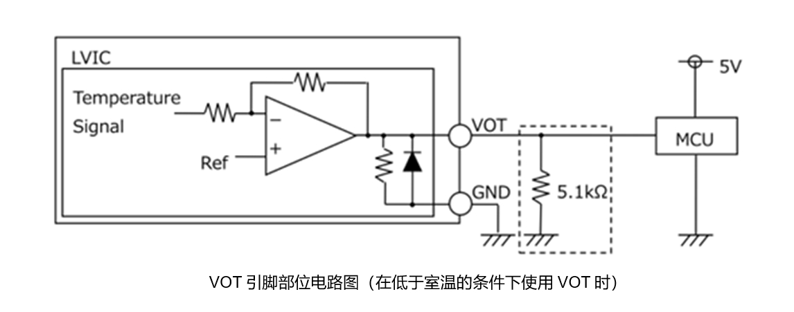 如果在LVIC温度低于室温(25°C)时需要VOT输出的线性度,建议在VOT引脚和接地端(GND)之间连接5.1kΩ的下拉电阻(参考下图和上图)。