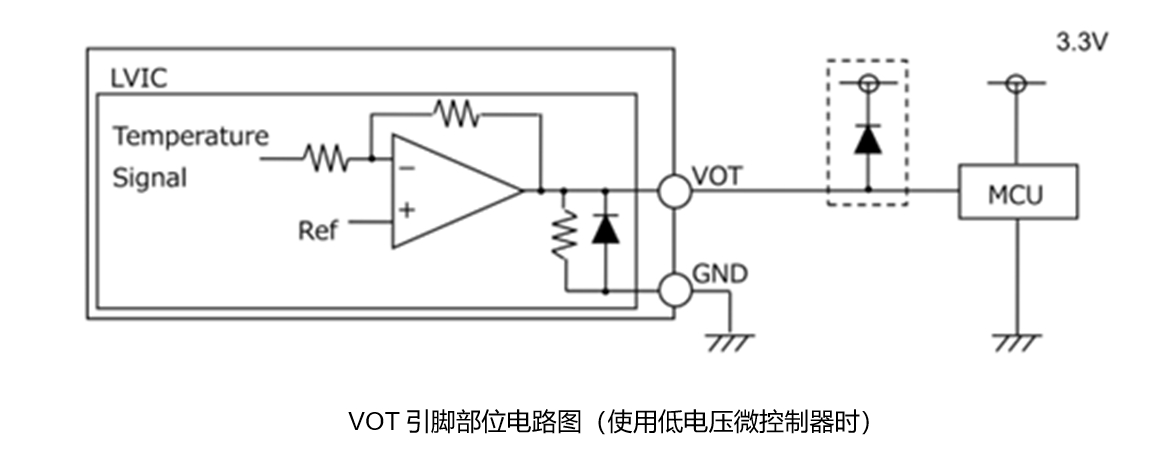 当使用低电压微控制器来处理VOT输出时,存在温度升高时VOT输出超过微控制器电源电压的可能性。根据上面给出的规格值,在LVIC温度为 90°的条件下,VOT输出最大为2.82V。当使用3.3V微控制器时,建议在VOT引脚和微控制器电源之间安装钳位二极管,以保护微控制器(见下图)。
