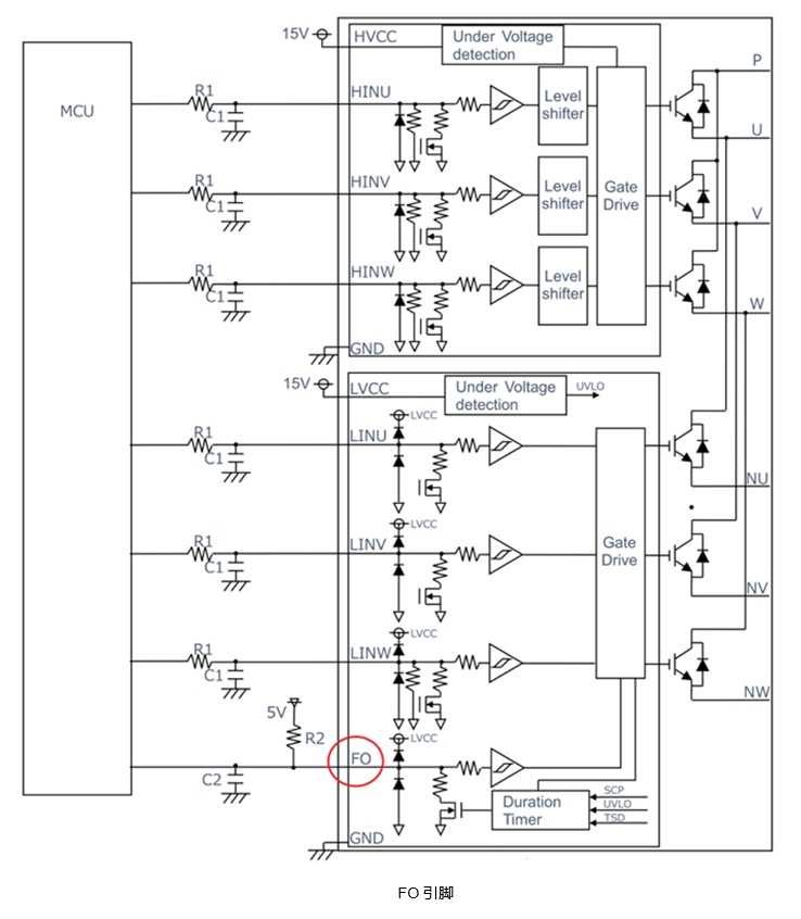 下面是包括与MCU的连接示例在内的框图。红线圈起来的引脚为FO引脚。FO引脚为IO配置,输出为开漏输出,输入为施密特触发缓冲器输入。该输入监控FO引脚的输入电平,并在输入为L电平期间关断下桥臂各相的IGBT。另外,通过给FO引脚连接外置电容和电阻,还可以扩展下桥臂的关断时间。