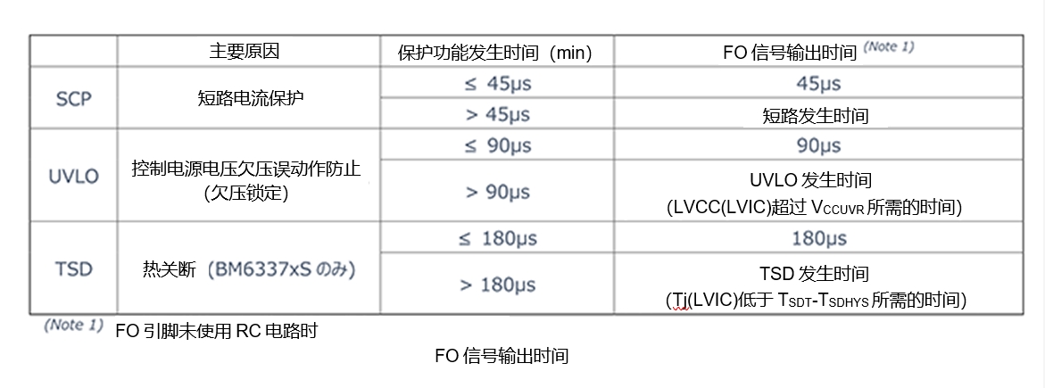 该IGBT IPM系列的LVIC(低边IGBT栅极驱动器)单元内置SCP(短路电流保护)、UVLO(欠压锁定,防止控制电源欠压误动作)和 TSD(热关断保护功能*仅限BM6337xS)等保护功能,如各保护功能的说明中所提到的,当保护功能启动时,FO引脚将从H电平转换为L电平。