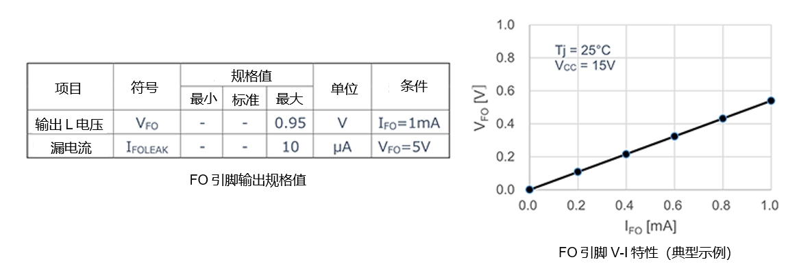 FO引脚为开漏输出,因此需要上拉电阻。FO引脚的绝对最大额定值,施加电压VFO为-0.5V~Vcc+0.5V(FO-GND引脚之间),灌电流IFO为1mA,因此需要在这些范围内决定上拉电压和电阻。IFO可以通过上拉电源电压和上拉电阻值粗略地计算出来。另外,除了绝对最大额定值之外,还需要考虑FO引脚的输出规格和所连接MCU的输入规格(VIL、VIH等)。下面是FO输出的规格值和FO引脚的V-I特性。