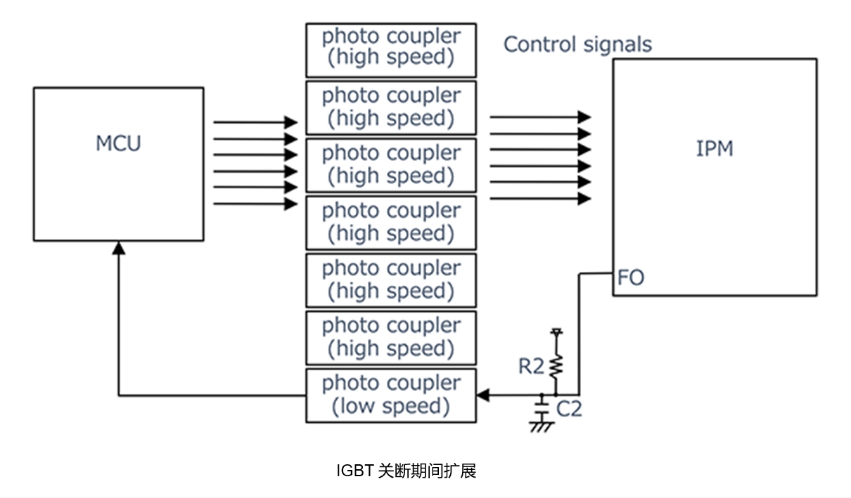 ・FO引脚的输入功能,通过在FO引脚上连接RC并调整时间常数,可以扩展下桥臂各相IGBT的关断时间。