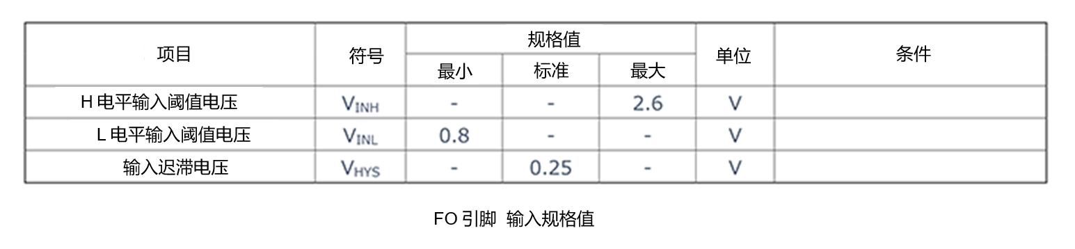 所连接RC的时间常数根据FO引脚的输入规格进行调整。需要考虑到下表中的阈值和迟滞电压规格值。
