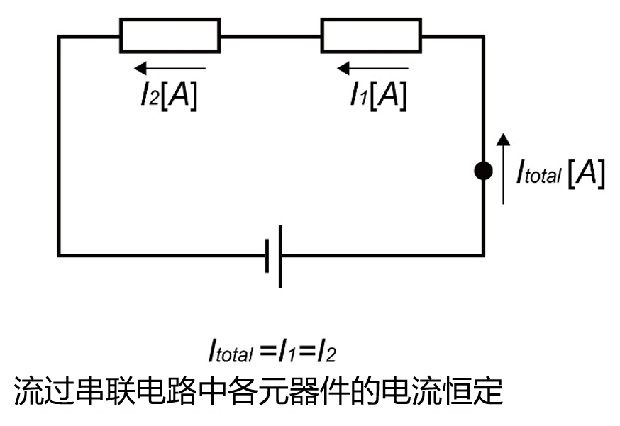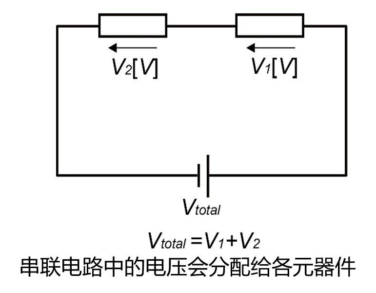 \(I_{total}=I_1=I_2=I_3=・・・\) - 电压(\(V\))分为各元器件的电压,总电压为电源电压(\(E\))。各元器件的电压分配与其电阻值成正比。