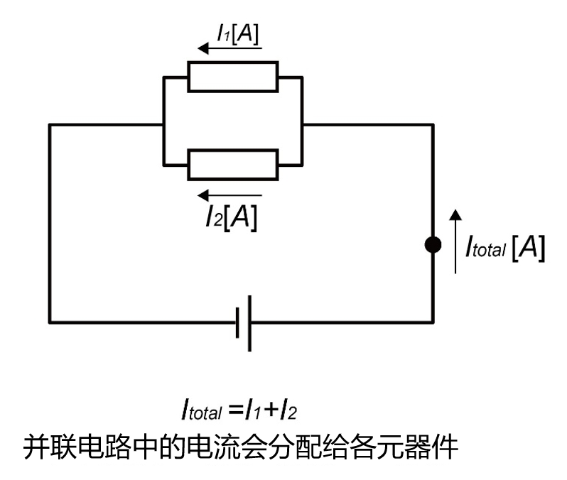 \(V_{total}=V_1=V_2=V_3=・・・\) - 电流(\(I\))分为各元器件的电流,总电流为电源电流(\(I\))。各元器件的电流分配与其电阻值成反比。