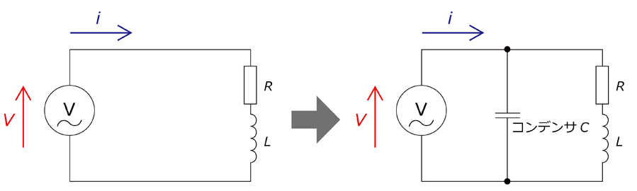 实际上在商用电力系统或电机负载等应用中进行功率因数校正时,虽然在理论上将\(R、L\)和\(C\)全部串联起来进行功率因数校正的方法是可行的,但在实际设备中这种方法并不常用。大多数情况下是采用“负载(\(R-L\))与电容器并联连接”的方式。这是因为用电容器的无功电流来抵消供给侧角度的“无功电流”是很方便的。
