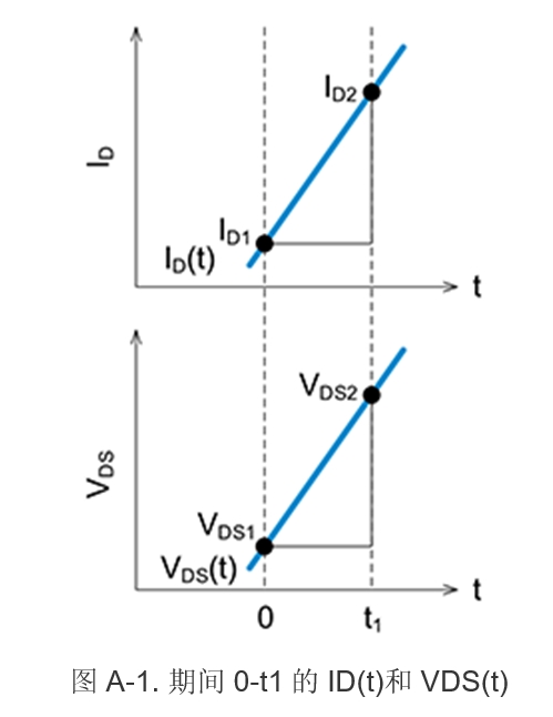 在本文中,我们根据开关波形的漏-源电压VDS和漏极电流ID,使用线性近似方式计算开通时和关断时的功率损耗(开关损耗)。图A-1是用于损耗计算的波形。