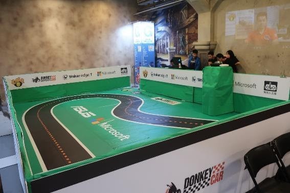 Maker Faire Taipei 2019(2019年台北制汇节)的测试场地。您可以看到资助公司的标志,如DONKEY CAR(驴车)、ASUS(华硕)和Microsoft(微软)。DIY自动驾驶小车正在变得越来越受欢迎