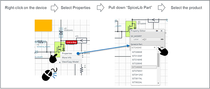 下图列出了PTC加热器热仿真中使用的主要组件名称。各组件的初始值请参照下表。部分组件支持从预先配备的组件清单中选择所需产品。后面一个表格中列出了可更换的组件及其产品名称清单。更改组件名称的步骤如后一个图所示,在组件上右键单击,选择”Properties”选项,然后从“Property Editor”的“Spicelib Part”中选择要使用的产品名称。