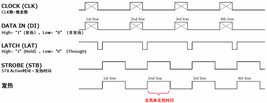 当输入STB信号时,能量就会施加到发热体上,使其发热。对于热敏打印头而言,如果施加的能量超过一定阈值,发热体就会损坏,进而影响打印质量和发热体的使用寿命。因此,在使用过程中,请确保STB信号的输入时间不超过额定能量上限所对应的时长。